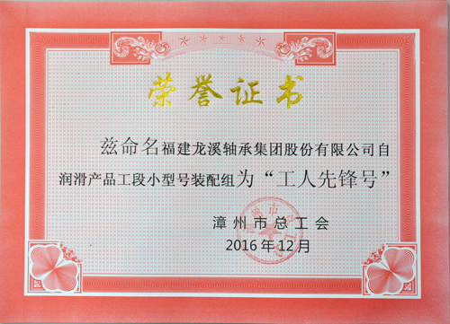 2016年,公司自润滑产品工段小型号装配组收获颇丰,继获得公司2015年度“先进班组”后,又被漳州市总工会授予漳州市“工人先锋号”及“女职工标兵岗”荣誉称号。