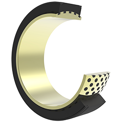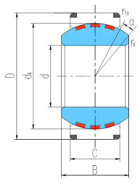 产品特点:外圈沿轴向剖分成两半,用锁圈固定,外圈材料为轴承钢,淬火,磷化,球面镀硬铬;内圈材料为铜合金,球面镶嵌固体自润滑材料。