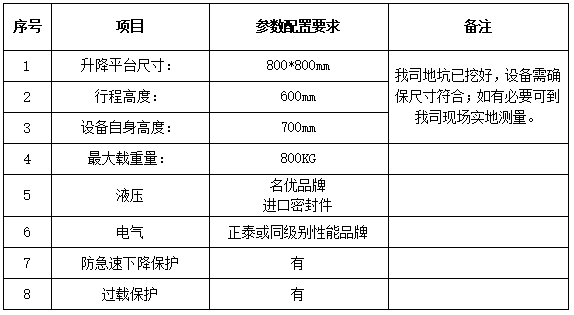 8. 0.8吨液压升降平台参数配置要求