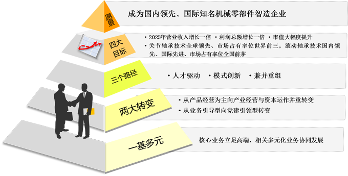 保持战略定力,以需求牵引供给,以供给创造需求,精心谋划“一基多元”为基点的发展战略,打造国内领先、国际知名的机械零部件智造企业。