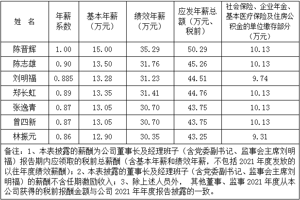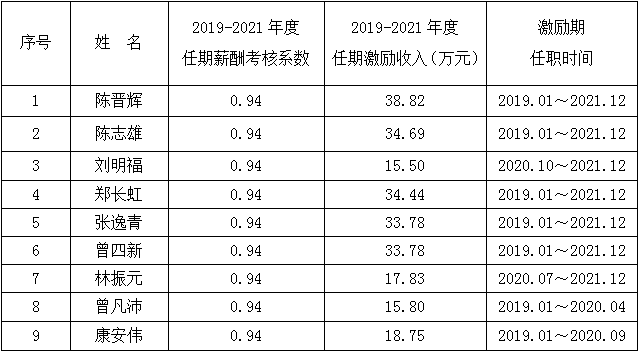 根据漳州市国资委及《公司董事长、经理班子年薪方案》的有关规定,同意公司董事长及经理班子人员(含党委副书记、监事会主席刘明福)2021年度薪酬方案修订如下: